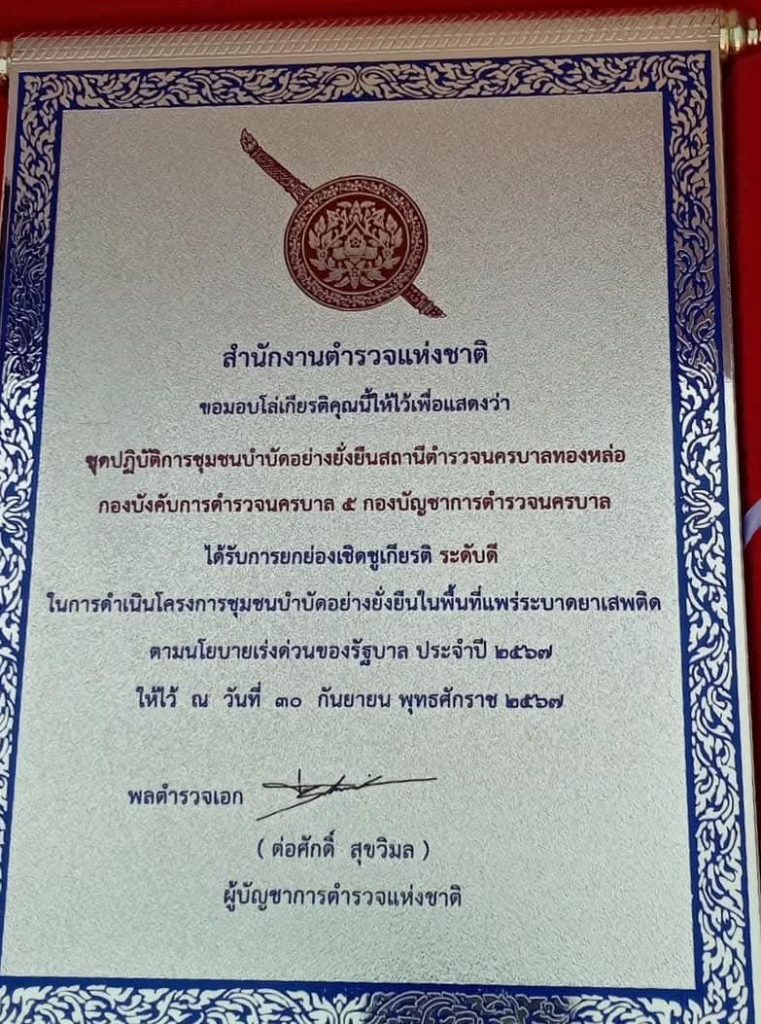 ที่ได้รับรางวัลโล่ยกย่องเชิดชูเกียรติในระดับดี ตามยุทธศาสตร์ชาติ นโยบายเร่งด่วนของรัฐบาล ซึ่งเกิดจากการมุ่งมั่นตั้งใจแก้ไขปัญหายาเสพติดจากการลงตรวจชุมชนอย่างจริงจัง จากเจ้าหน้าที่ตำรวจชุมชนสัมพันธ์ นำโดย พ.ต.ท.มังกร พรหมศักดิ์ สวป.(ชส.)สน.ทองหล่อ และได้รับความร่วมเป็นอย่างดีจากชุมชนบ้านกล้วย แขวงคลองเตย เขตวัฒนา ซึ่งจะเป็นชุมชนตัวอย่างในการแก้ไขปัญหายาเสพติด ของ สน.ทองหล่อต่อไป