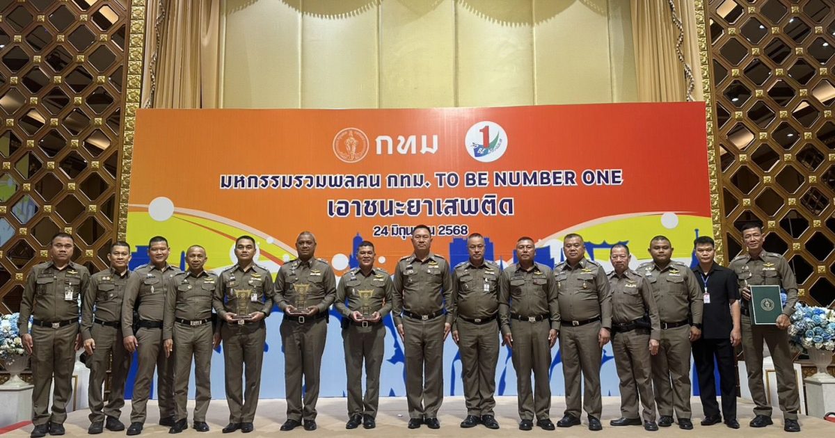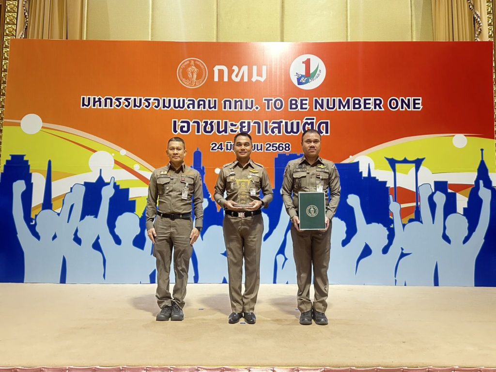 TO BE NUMBER ONE มิถุนายน 24, 2568 โดย admin / ข่าวประชาสัมพันธ์,ข่าวกิจกรรม,ข่าวประชาสัมพันธ์ TO BE NUMBER ONE วันที่ 24 มิ.ย.68 พ.ต.ท.ณัฐกิตติ์ จอกโคกสูง รอง ผกก.ป.สน.ทองหล่อ เป็นผู้แทน สน.พร้อมด้วย พ.ต.ท.มังกร พรหมศักดิ์ สวป.(ชส.) สน.ทองหล่อ, ร.ต.อ.คมสรร ของพิมาย รอง สวป.สน.ทองหล่อ ร่วมในพิธีเปิดและรับโล่เกียรติคุณ จากมหกรรมรวมพลคน กทม.TO BE NUMBER ONE เอาชนะยาเสพติด ได้รับการยกย่องเชิดชูเกียรติ รับการประเมินจากโครงกร ชุมชนบำบัดฯ 2567 เฟส 2 ได้อันดับที่ 2 ของ บช.น. ที่โรงแรม ปรินซ์ พาเลซ ป้อมปราม กรุงเทพฯ