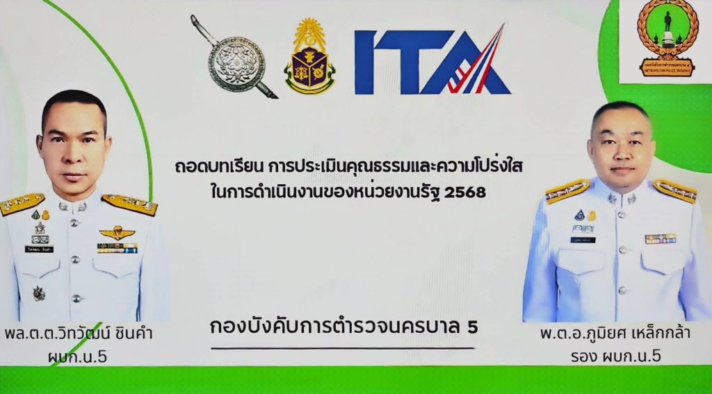 ถอดบทเรียน ITA สิงหาคม 25, 2568 โดย admin / ข่าวประชาสัมพันธ์,ข่าวกิจกรรม,ข่าวประชาสัมพันธ์ วันที่ 25 ส.ค.68 เวลา 10.00 น. พล.ต.ต.วิทวัฒน์ ชินคำ ผบก.น.5 ประธานการประชุม ผู้ร่วมประชุม ประกอบด้วย พ.ต.อ.ภูมิยศ เหล็กกล้า รอง ผบก น.5 r.ต.อ.รัฐธนนท์ เอกฐิติกุลพัทธ์ ผกก.สน.ทองหล่อ และ ผกก.ในสังกัด บก.น.5 ทุก สน. สว.อก.และเจ้าหน้าที่ ITA ทุก สน. ร่วมประชุมการถอดบทเรียนการประเมินคุณธรรมและความโปร่งใส ในการดำเนินงานของหน่วยงานภาครัฐ (ITA) ที่ห้องประชุม บก.น.5